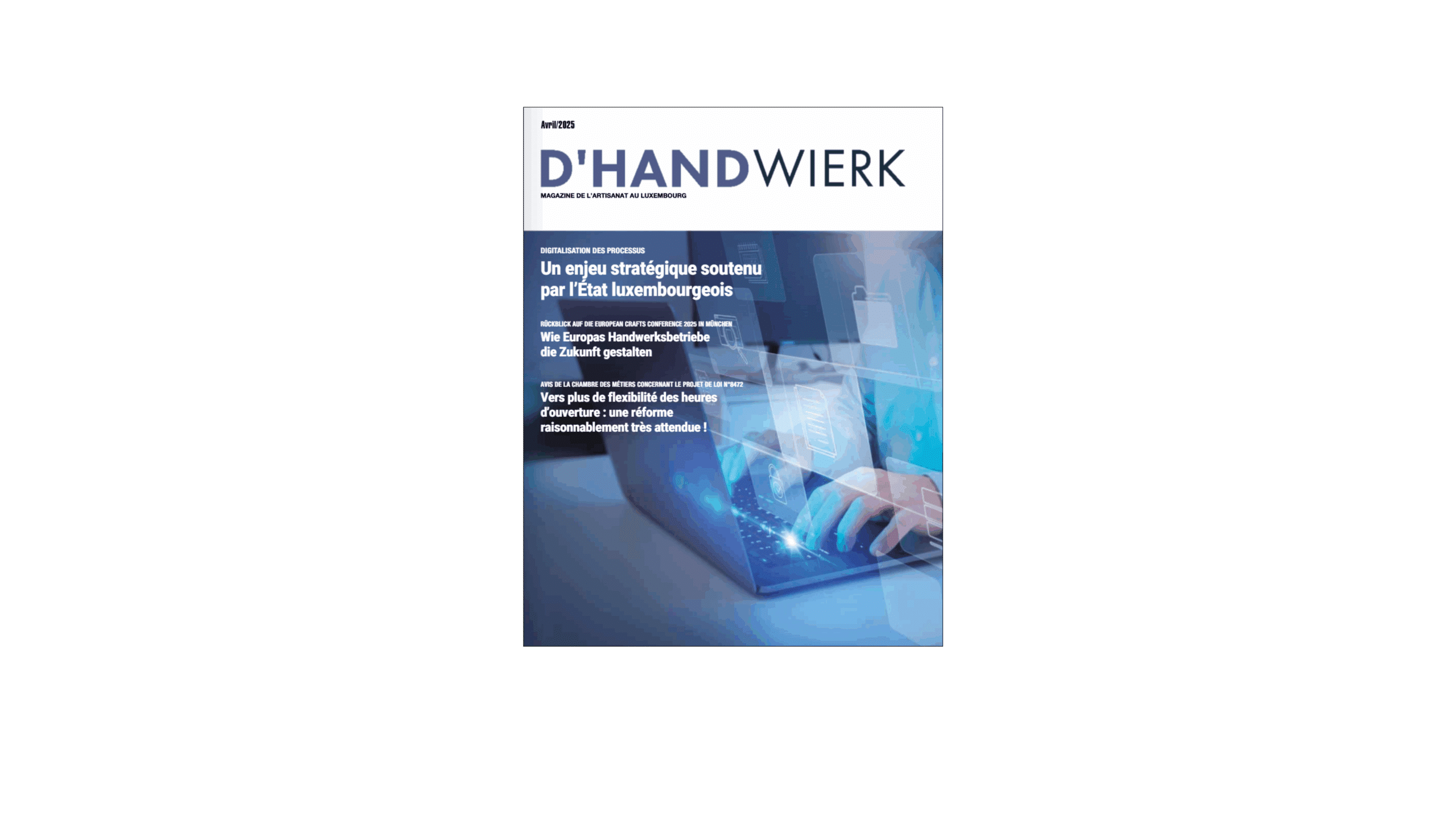 D’Handwierk s’adresse au secteur de l’artisanat et bénéficie d’une distribution à toutes les entreprises artisanales établies au Luxembourg. Le secteur représente 9.120 entreprises employant plus de 103.000 salariés et constitue ainsi le premier employeur du pays. Le magazine au contenu bilingue (DE/FR) traite de l’actualité politique et économique, des news des entreprises, d’informations services et des articles de fond sur des thématiques concernant l’artisanat.